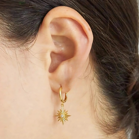 Boucles d'oreilles fleurs dorées avec perles et pierre verte plaqué or