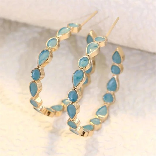 Boucles d'Oreilles Créoles Dorées avec Opale Bleue Vintage
