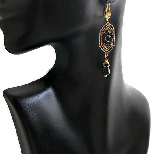 Boucles d'Oreilles Vintage en Cristaux Noirs Suspendus Or