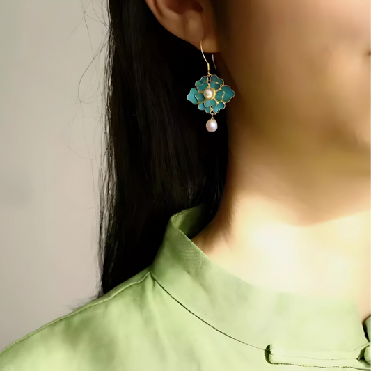 Boucles d'oreilles lotus bleues perles vintage plaqué or