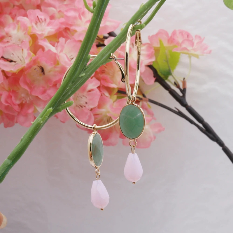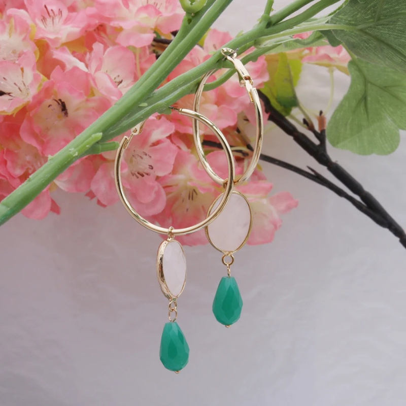 Ajoutez une touche d'élégance avec ces boucles d'oreilles créoles plaquées or, ornées d'une délicate pierre de cristal verte. Parfaites pour des tenues décontractées ou formelles, elles sont résistantes à l'eau, à la sueur et à la chaleur, offrant un éclat durable.
